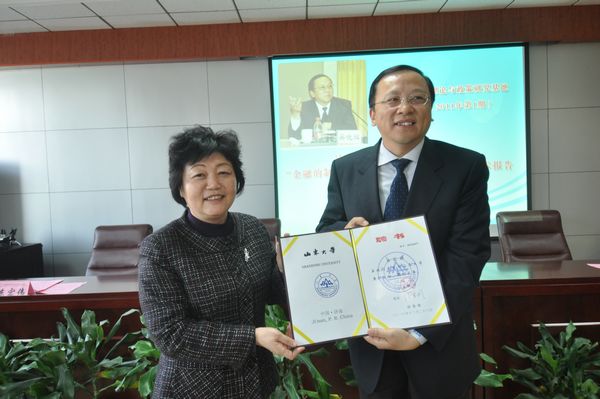 3月10日下午,经济学院在聚贤报告厅举办吴晓辉兼职教授聘任仪式暨“金融的制度属性与现代金融业的发展”学术报告。招商银行济南分行党委书记、行长吴晓辉,山东大学副校长樊丽明教授,招商银行养老金金融部总经理助理陈芳,招商银行济南分行办公室主任卢燕,人力资源部总经理赵桂珍,山东大学合作发展部副部长刘学祥,经济学院常务副院长胡金焱,金融系主任曹廷求教授等出席了报告会。仪式上,樊丽明副校长为吴晓辉行长颁发了山东大学兼职教授证书,聘任仪式由经济学院党委书记陈宏伟主持。