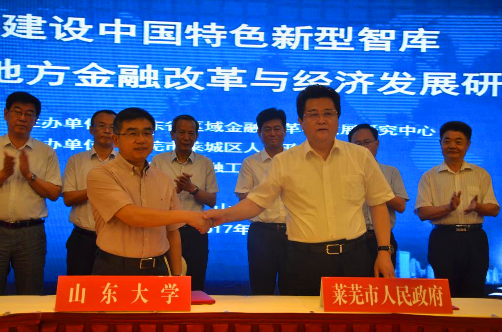 会议由莱城区委书记马保岭主持。会上,山东省区域金融改革与发展研究中心与莱芜市莱城区人民政府以及莱芜市金融工作办公室就建设中国特色新型智库达成了合作共识。在与会代表的见证下,胡金焱与孟令兴签订了合作协议。该合作协议达成后,将为政府、科技园区、科技企业、金融机构等各类经济主体提供综合性咨询服务。